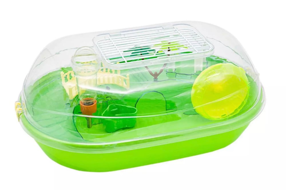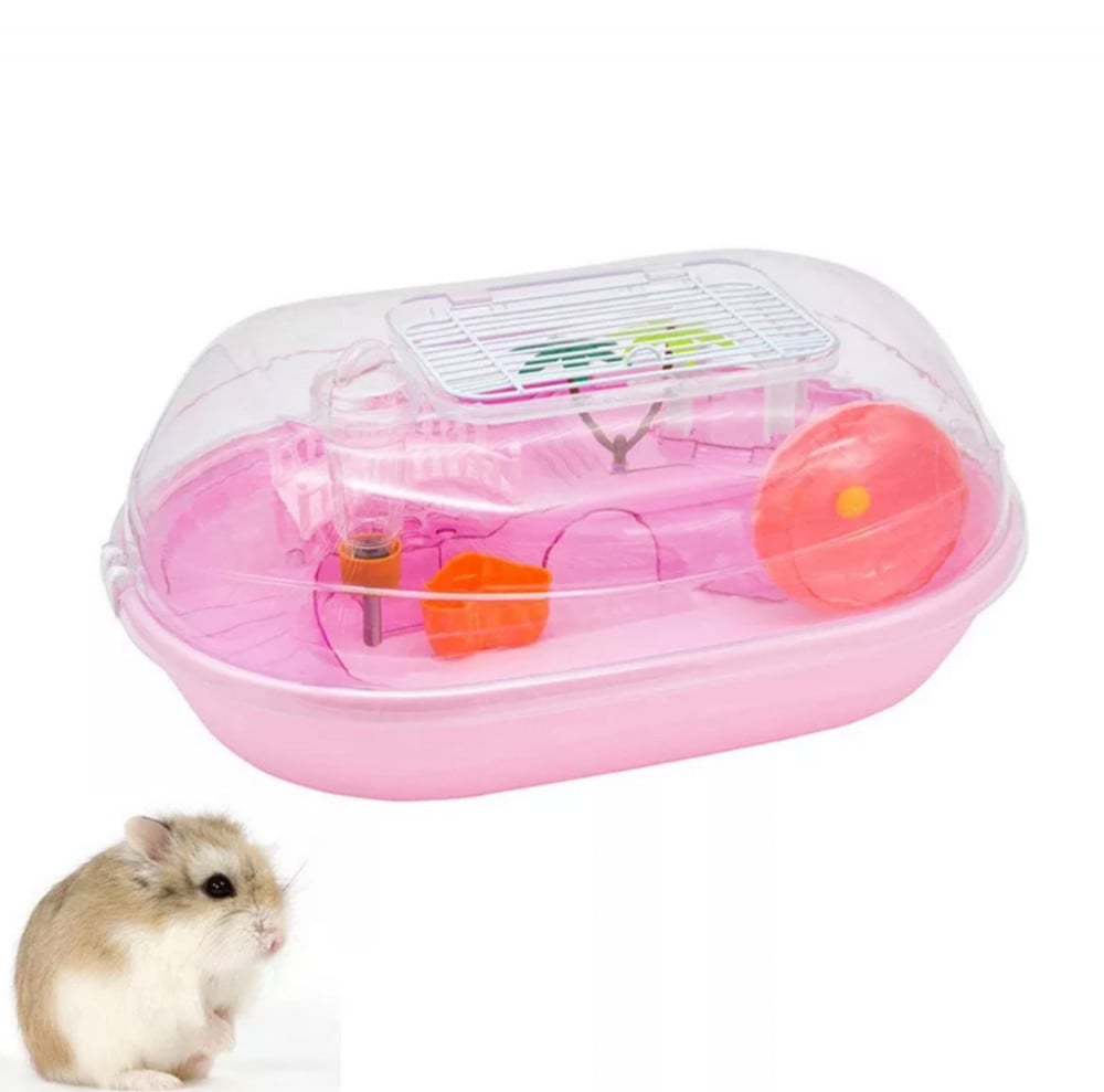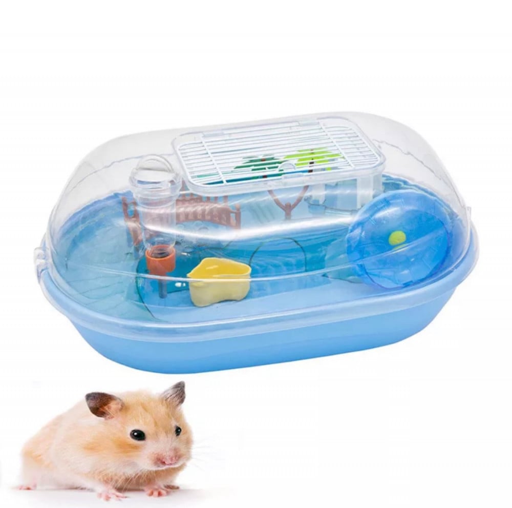 قفص بلاستك مصمم للقوارض أو السلاحف الصغيرة مكون من طابق مغلق وغطاء شفاف ؛ مجهز بجميع الملحقات الضرورية للتغذية والإضافية للعب والترفيه مع باب علوي قابل للتهوية.