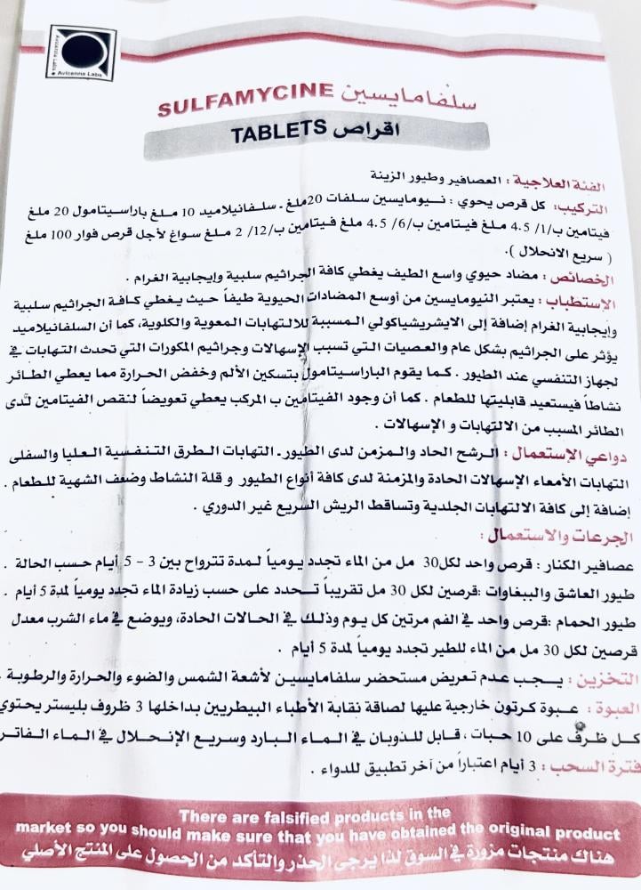 طيور الحمام : قرص واحد في الفم مرتين كل يوم وذلك في الحالات الحادة، ويوضع في ماء الشرب معدل قرصين لكل 30 مل من الماء للطير تجدد يوميا لمدة 5 أيام